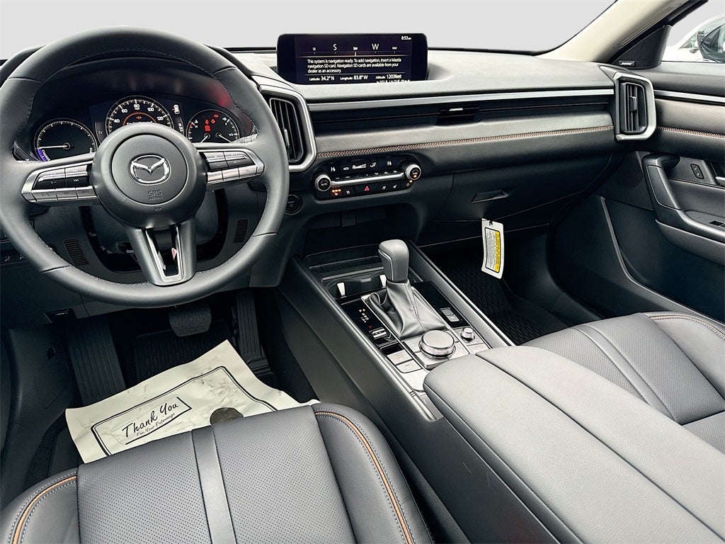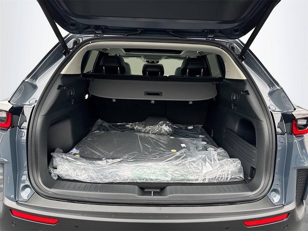 Inside the cabin you will find a refined space filled with premium amenities including ventilated front seats heated front seats leather trimmed seating an 8 way power driver seat with lumbar support a 6 way power passenger seat driver seat memory auto dimming rearview mirror a power panoramic moonroof dual zone climate control rear air vents a leather wrapped steering wheel a leather wrapped gear selector Mazda Advanced Keyless Entry push button start and a retractable cargo cover for added convenience. Technology is impressive with a Bose 12 speaker audio system wireless Apple CarPlay wireless Android Auto wireless phone charging Alexa Built in Mazda Connected Services four USB type C inputs and a 10.25-inch color center display with the multi-function commander control.