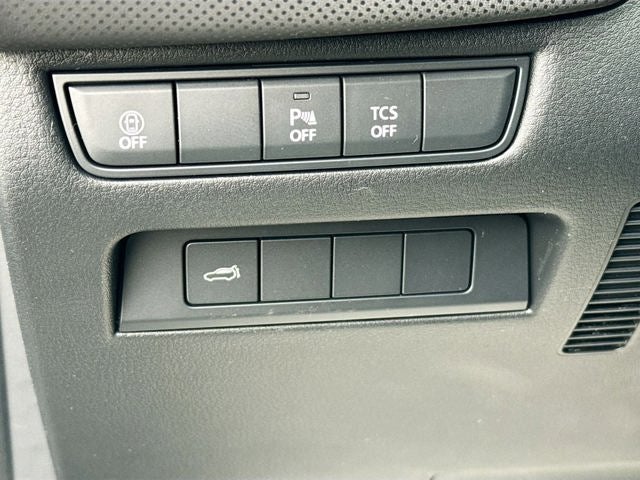Safety is a major highlight with advanced features including a backup camera, Blind Spot Monitoring, Rear Cross Traffic Alert, Lane Departure Warning System, Emergency Lane Keeping with Road Keep Assist, Lane Keep Assist, Mazda Radar Cruise Control with Stop and Go, Smart Brake Support with Head On Collision Mitigation, Driver Attention Alert, Vehicle Exit Warning, ABS with EBD and Brake Assist, Dynamic Stability Control, Traction Control System, tire pressure monitoring, advanced dual front airbags, front side impact airbags, front and rear side air curtains, and front knee airbags.