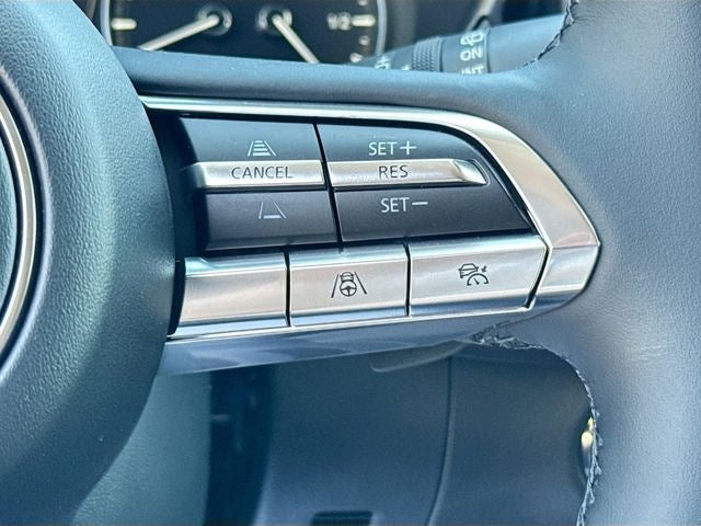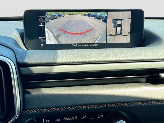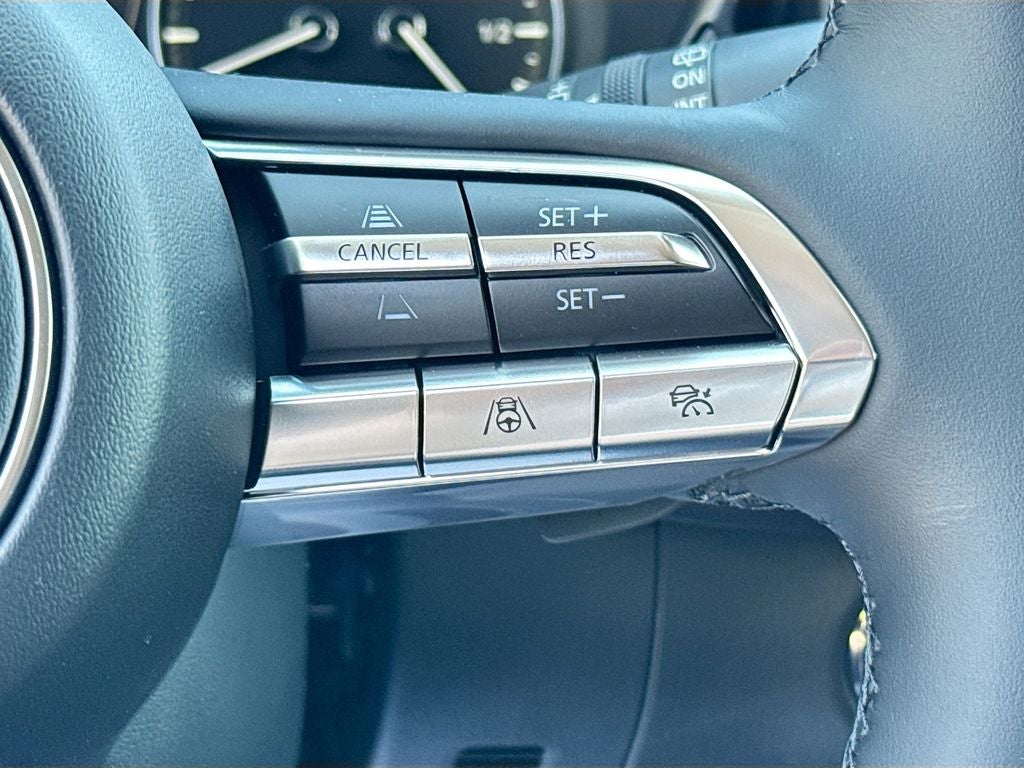 Safety is comprehensive and advanced, featuring 360 degree view monitor, blind spot monitoring, blind spot assist, front cross traffic alert, rear cross traffic alert, smart brake support, smart brake support reverse, smart brake support with turn across traffic and front crossing, lane departure warning system, lane keep assist, emergency lane keeping with road keep assist, Mazda radar cruise control with stop and go, cruising and traffic support, traffic sign recognition, vehicle exit warning, front and rear parking sensors, traction control system, dynamic stability control, tire pressure monitoring system, advanced dual front airbags, front knee airbags, and front and rear side curtain airbags.