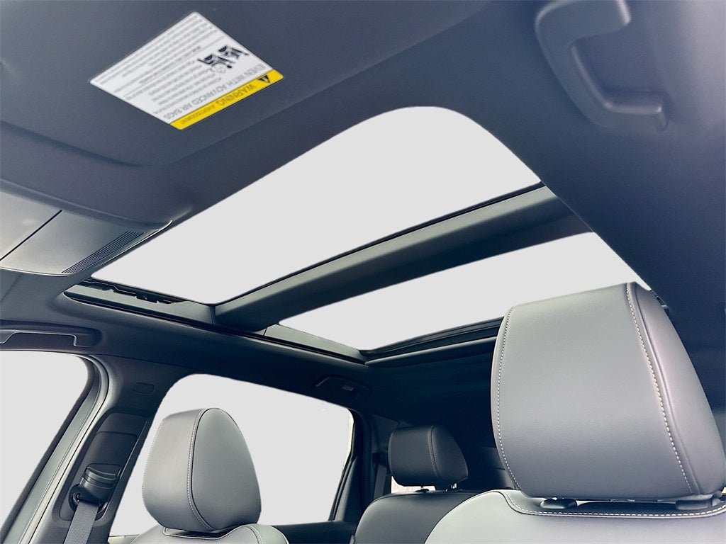 The exterior showcases a bold design with machine cut 21 inch alloy wheels wrapped in P275 45 R21 all season tires, hands free power rear liftgate, adaptive front lighting system, LED headlights with auto on off function, honeycomb piano black grille, heated side mirrors with memory and tilt, power panoramic moonroof, rain sensing windshield wipers, and piano black roof rails. Added accessories include black lug nuts, black wheel locks, front splash guards, and rear splash guards for additional protection and style.