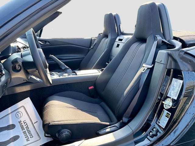 The exterior keeps things clean and sporty with a manual Z shape folding black cloth convertible top, 16 inch black alloy wheels, LED headlights and taillights, dual exhaust outlets, glass rear window with defogger, and dual power side mirrors. This Miata is all about lightweight fun and timeless design.