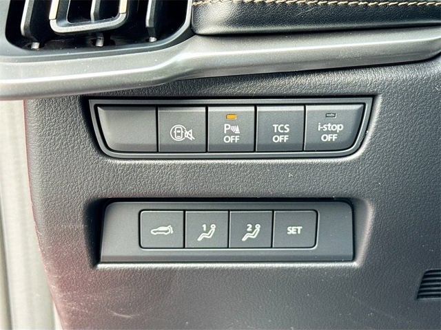 Safety is engineered into every detail with Blind Spot Monitoring with Vehicle Exit Warning, Lane Departure Warning, Lane Keep Assist, Emergency Lane Keeping, Traffic Sign Recognition, Smart Brake Support, Rear Cross Traffic Alert, Front Cross Traffic Alert/Braking, Cruising and Traffic Support, Mazda Radar Cruise Control, 360 View Monitor with See-Through and Trailer Hitch View, front and rear parking sensors, and a rearview monitor with dynamic lines for effortless parking. Additional protection includes frontal, knee, curtain, and side airbags, secondary collision reduction, and anti-theft engine immobilizer.