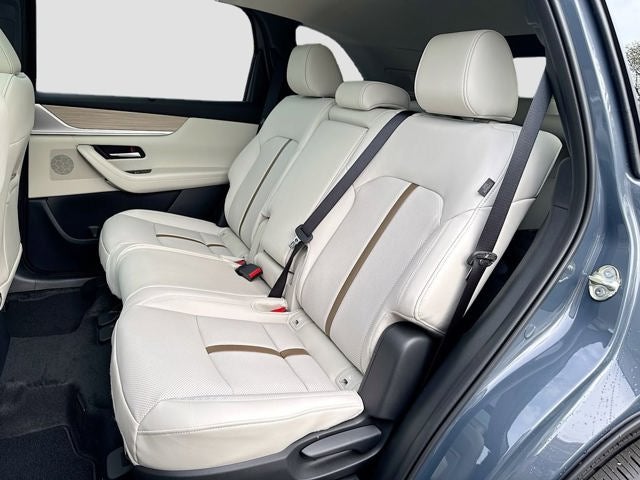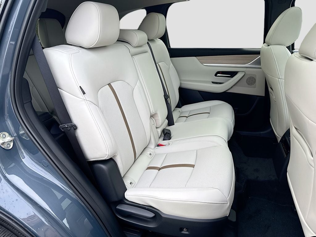 Inside, the cabin is thoughtfully designed with premium materials and advanced technology throughout. Highlights include ventilated front seats, heated front and second row seats, heated leather steering wheel, power tilt and telescopic steering column with memory, driver personalization system, 3 zone automatic climate control, Active Driving Display, 12.3 inch center display, 12.3 inch fully digital LCD gauge cluster, Mazda online navigation, Alexa built in, wireless Apple CarPlay, wireless Android Auto, wireless phone charger, Bose 12 speaker premium audio system, paddle shifters, second row window sunshades, and a backup camera.